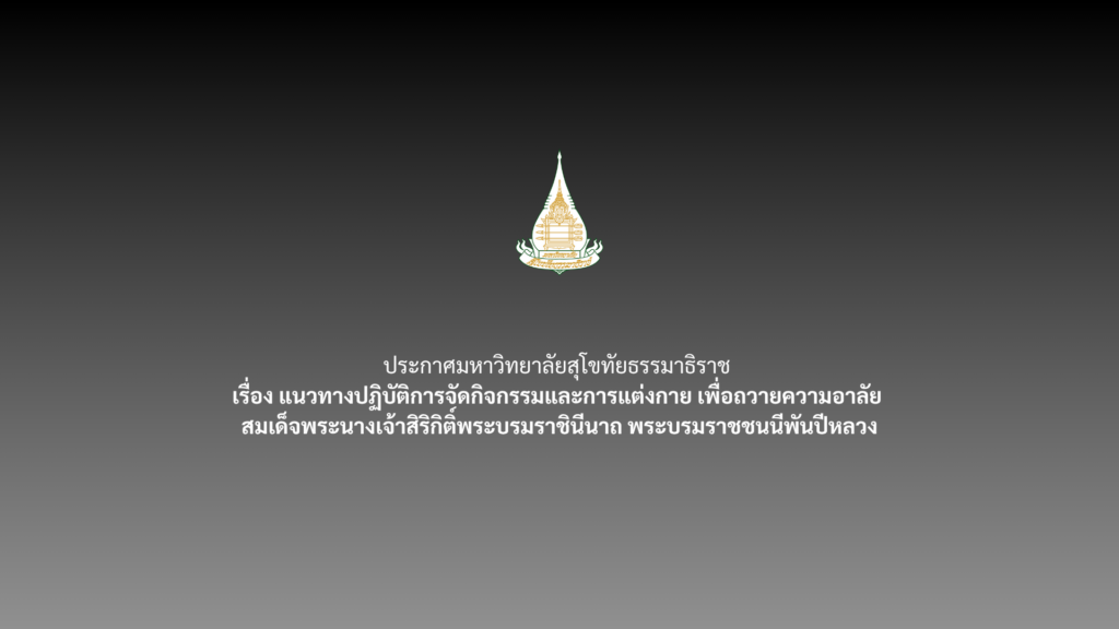 ข่าวกิจกรรมของมหาวิทยาลัย ประกาศมหาวิทยาลัยสุโขทัยธรรมาธิราช เรื่อง แนวทางปฏิบัติการจัดกิจกรรม และการแต่งกาย เพื่อถวายความอาลัย สมเด็จพระนางเจ้าสิริกิติ์ พระบรมราชินีนาถ พระบรมราชชนนีพันปีหลวง